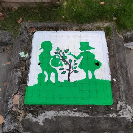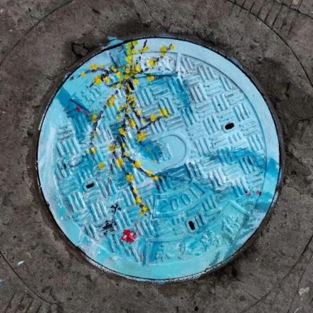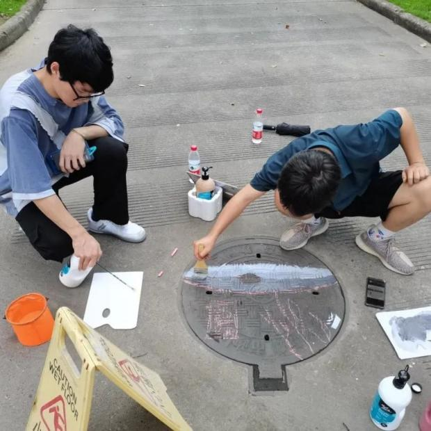 此次井盖涂鸦是由我系19级、20级学生共15人所绘。活动围绕动漫人物、环境保护、运动健康、西湖十景、二十四节气五个主题进行绘画创作。 “为井盖‘化妆’的过程并不算复杂,首先要将井盖清洗干净,用粉笔打个底稿,然后用丙烯颜料填色,晾晒一段时间后,最后用清漆刷一遍固色。”其中一位正蹲在地上的同学笑着说,“烈日下工作确实会有点辛苦,但一想到好的作品能让老师和同学们享受美,就觉得这些都是值得的。”