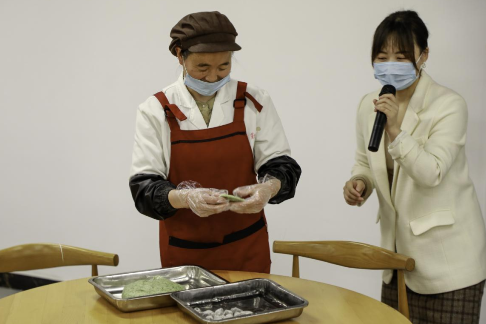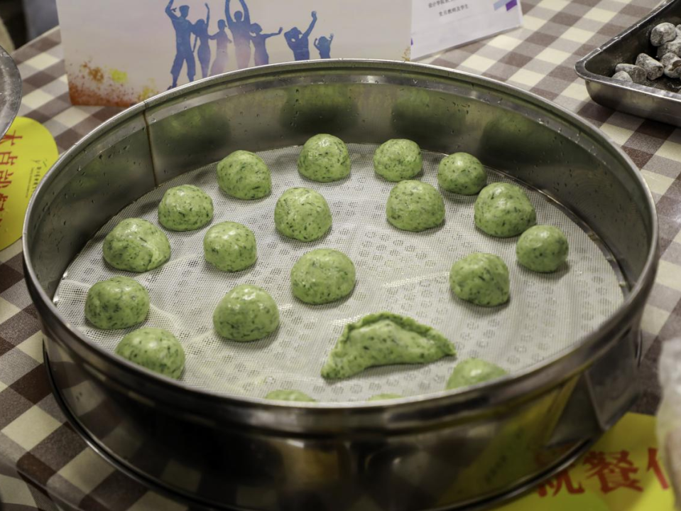 食堂师傅为大家详细讲解做青团的步骤,包括面团的揉搓方法、青团的包制手法和蒸制方式等。