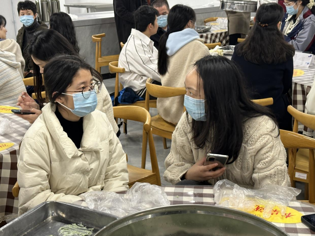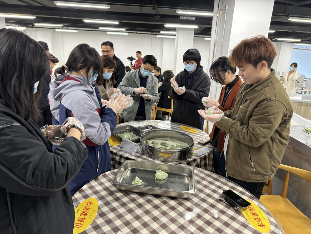 活动现场,热闹非凡。师生们相互配合、团结协作、忙活开来:倒糯米粉、拌艾草汁、揉搓成团、擀皮包馅……互相诉说着自己家乡清明节的习俗。