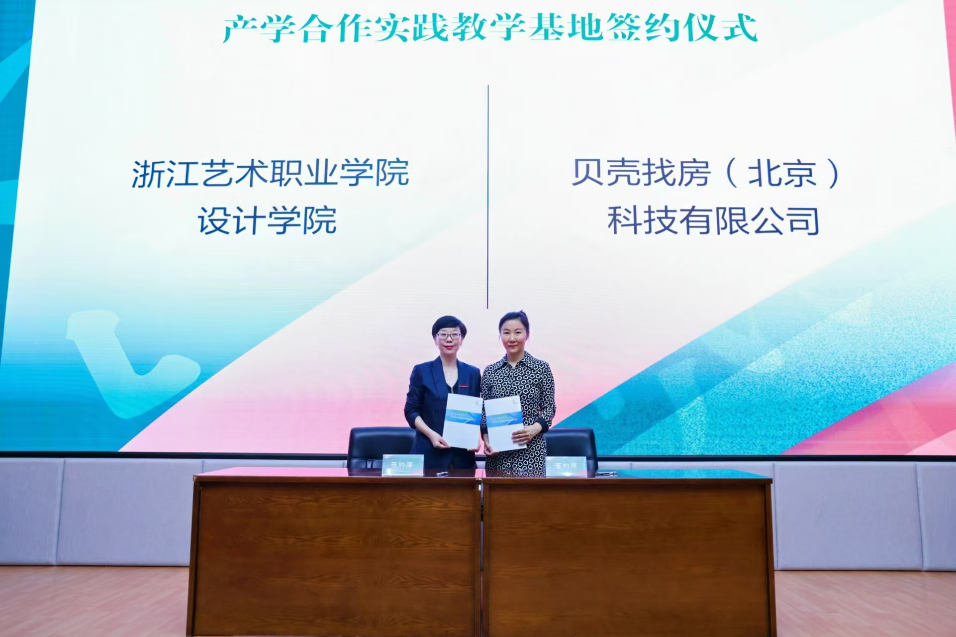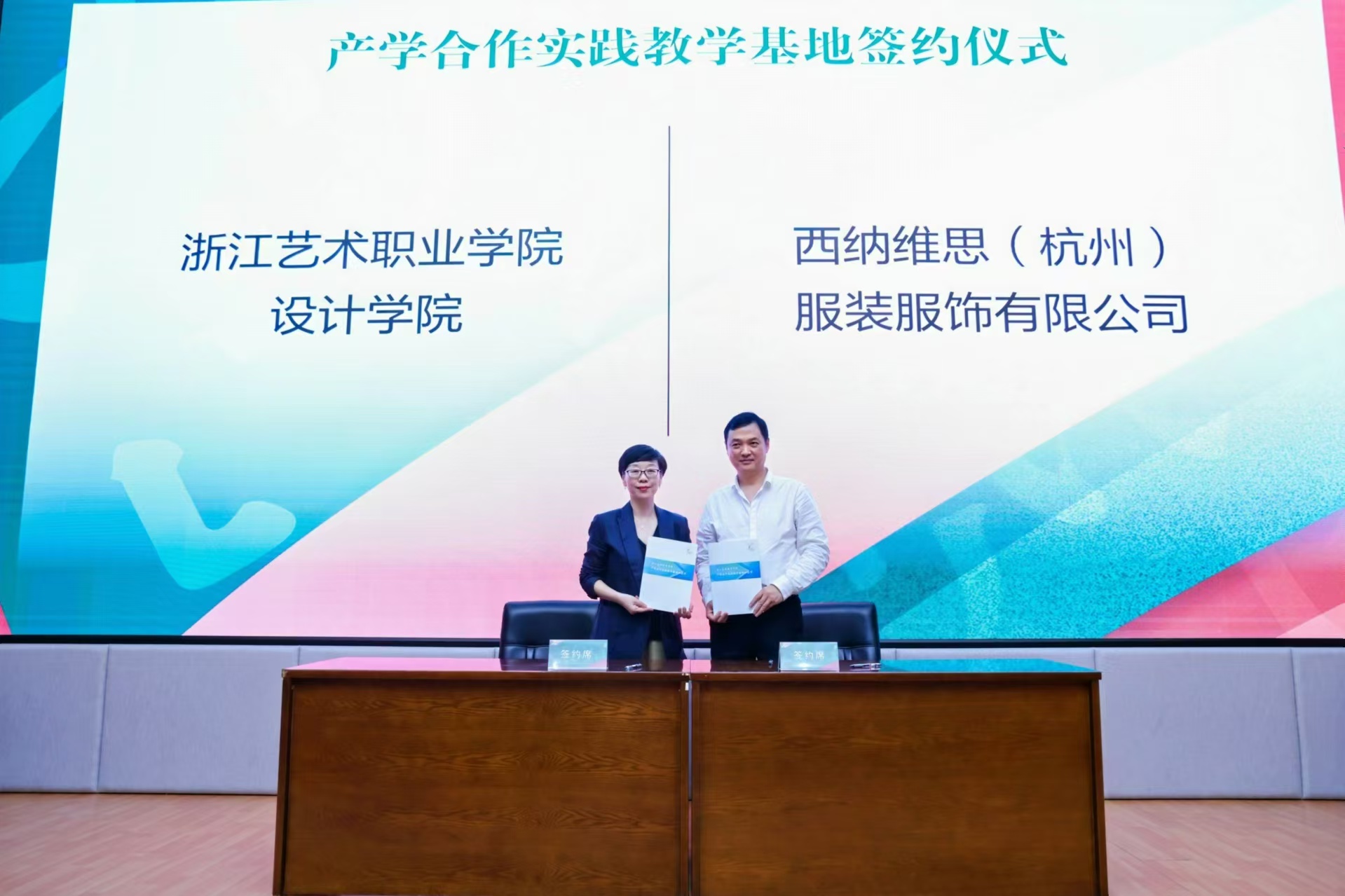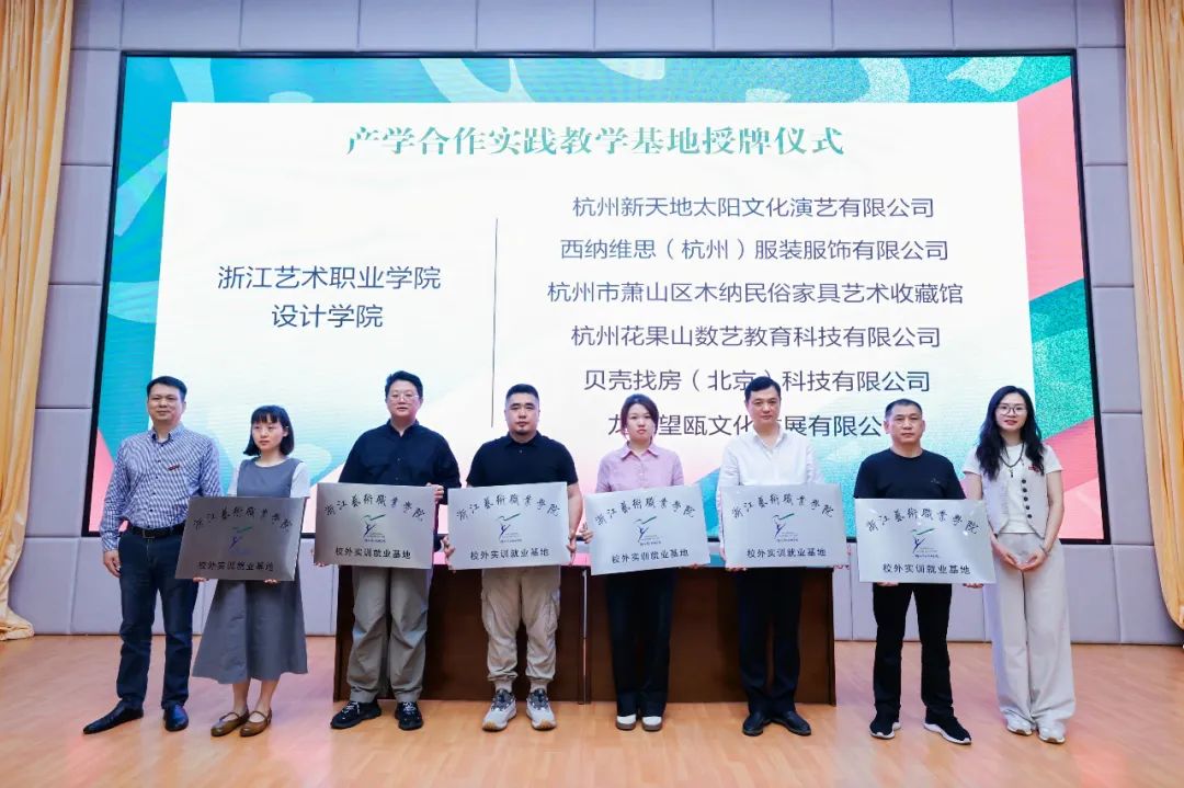 设计学院分别与杭州新天地太阳文化演艺有限公司,西纳维思(杭州)服装服饰有限公司,杭州市萧山区木纳民俗家具艺术收藏馆,杭州花果山数艺教育科技有限公司,贝壳找房(北京)科技有限公司,龙泉望瓯文化发展有限公司签订产学合作实践教学基地合作协议并授牌,进一步深化校企合作,构建协同育人新格局。