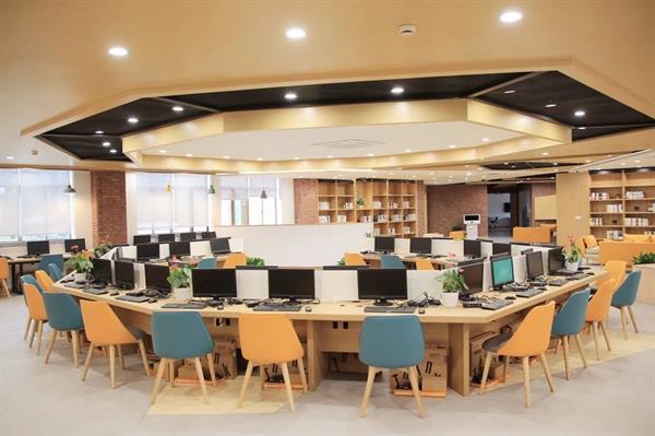焕然一新的信息共享空间由原来的“电子阅览室”升级而来。整个空间东、西区域贯通,分为数字媒体阅读区、学习阅读区、大小研讨室、视听欣赏室以及多媒体工作室(位于五楼西侧)。信息共享空间为师生们提供一站式服务中心和协同学习环境,是图信中心倾力打造并亮相的创新服务板块。为了能让大家身临其境地体验与时代接轨的科技元素,整个空间设计方案几易其稿,精益求精。从色调的配搭到空间剪裁的设计感,从皮质沙发的细腻纹路到高端电子设备的冰凉触感,科技与人文在此间尽情碰撞、融合共振。