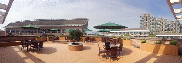 位于五楼一隅的空中花园,玲珑秀迤,满目葱茏。大大的阳伞点缀其间,天气好的时光,探出头便是天天天蓝,轻轻一嗅就是甜甜满满的桂花香。想象一下,手捧书卷,享受阳光和知识的双重沐浴,岂不乐乎?
