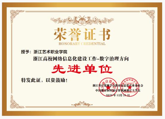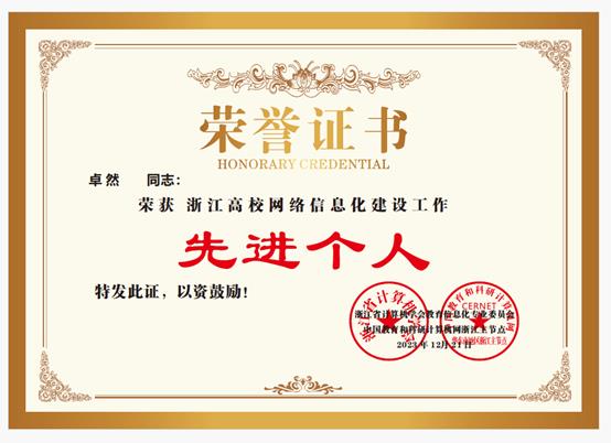 近日,浙江省计算机学会教育信息化专业委员会、中国教育和科研计算机网浙江主节点联合表彰了一批2023年高校网络信息化建设先进单位和先进个人。我校喜获“2023年浙江高校网络信息化建设先进单位-数字治理方向”、“2023年浙江高校网络信息化建设先进单位-网络安全方向”两项荣誉,图书信息中心卓然被评为“浙江高校网络信息化建设先进个人”。