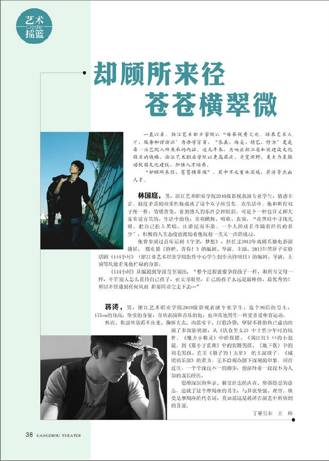 蒋涛,男,浙江省艺术职业学院2010级影视表演专业学生。这个90后的男生,175cm的身高,坚实的身姿,喜欢表演和音乐的他,也和其他男生一样更喜爱体育运动。