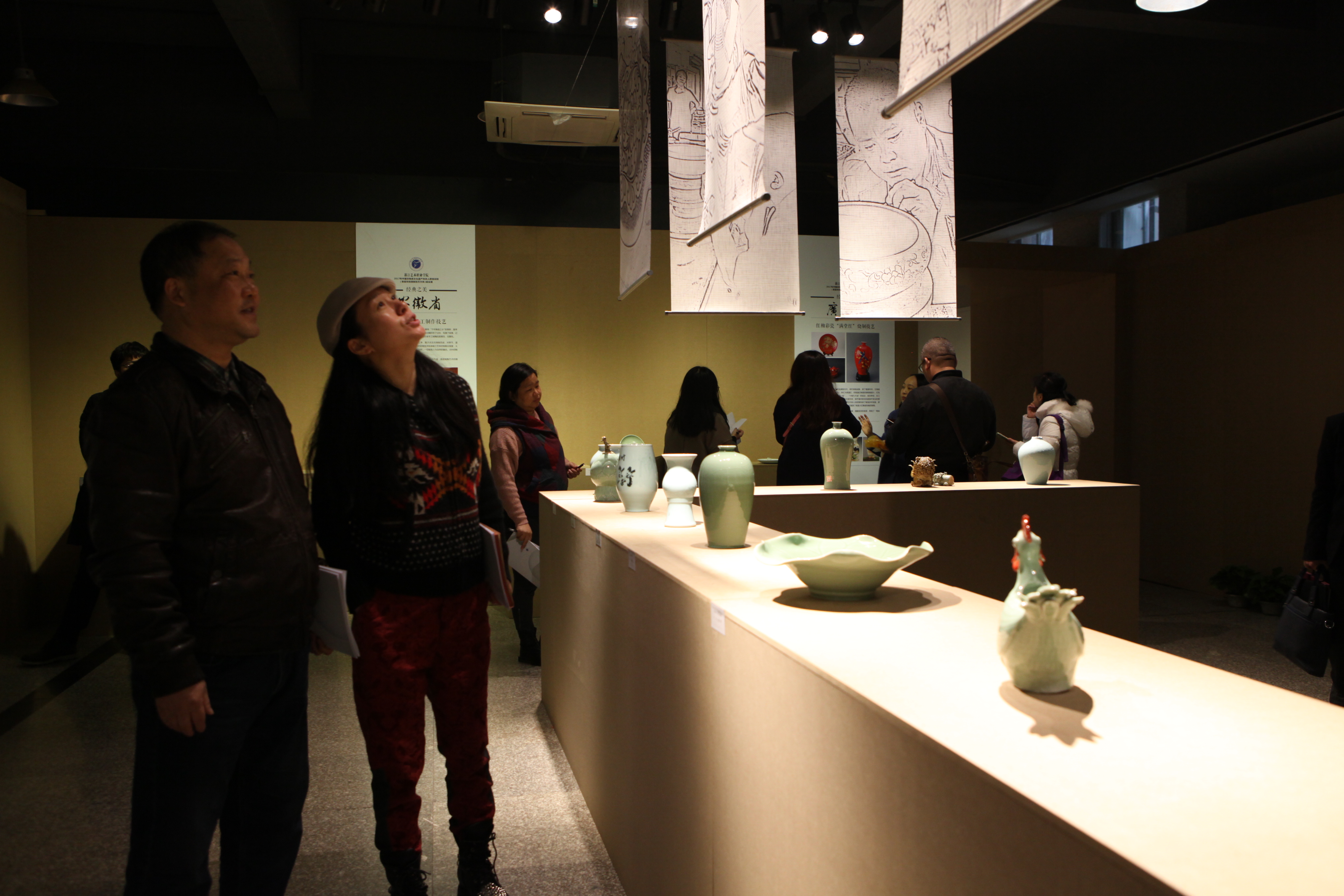 在浙江艺术职业学院4号楼1楼,有一场名为“埏土为器”展览正在展出,雅致的青瓷梅瓶、青瓷羊头尊等青瓷器皿,精致的青瓷摆件和颇具趣味的各式青瓷茶具、餐饮器,共100余件青瓷作品。这些都是来自五湖四海的非遗传承人学员们的作品。