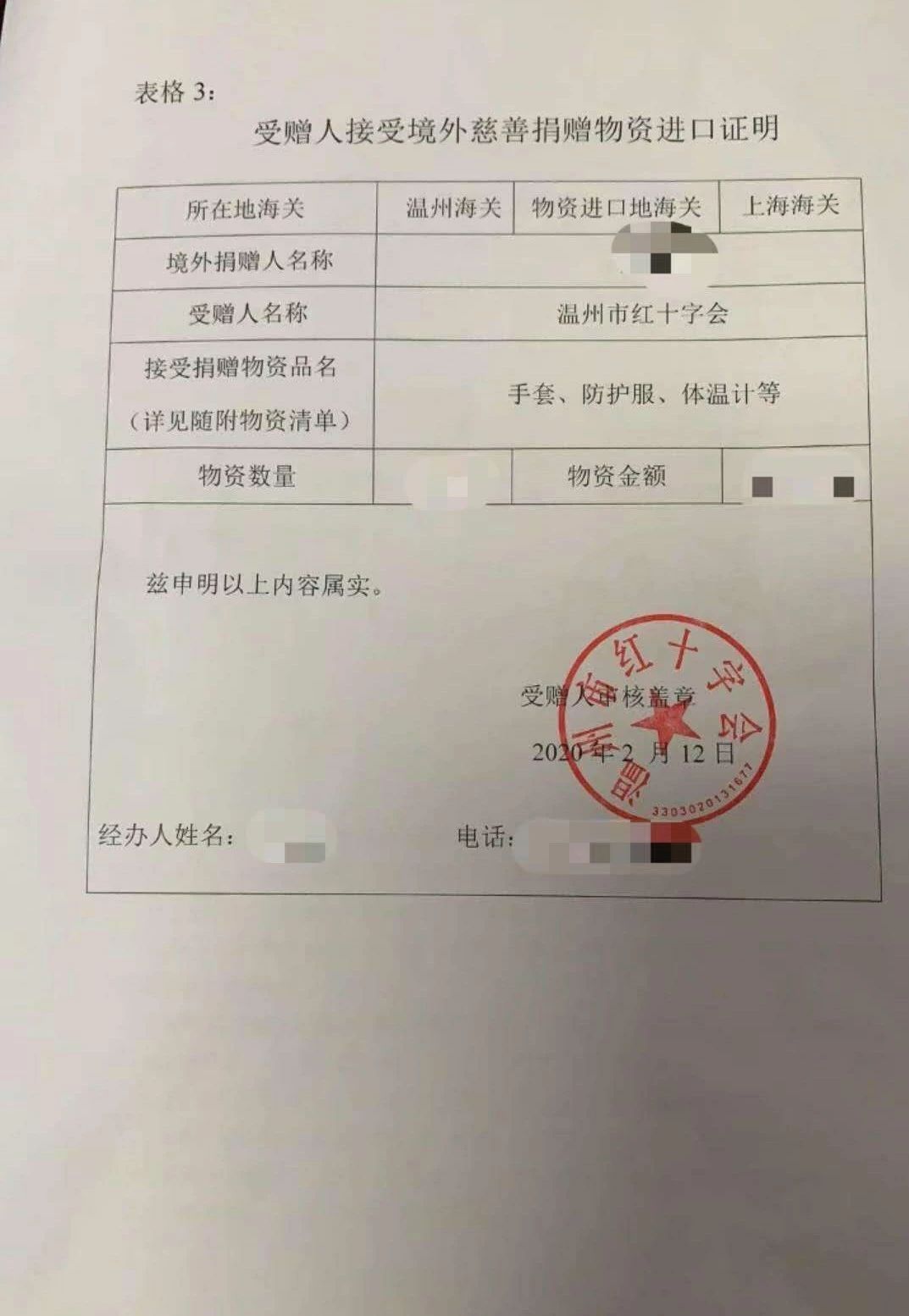 温州市红十字会受赠证明