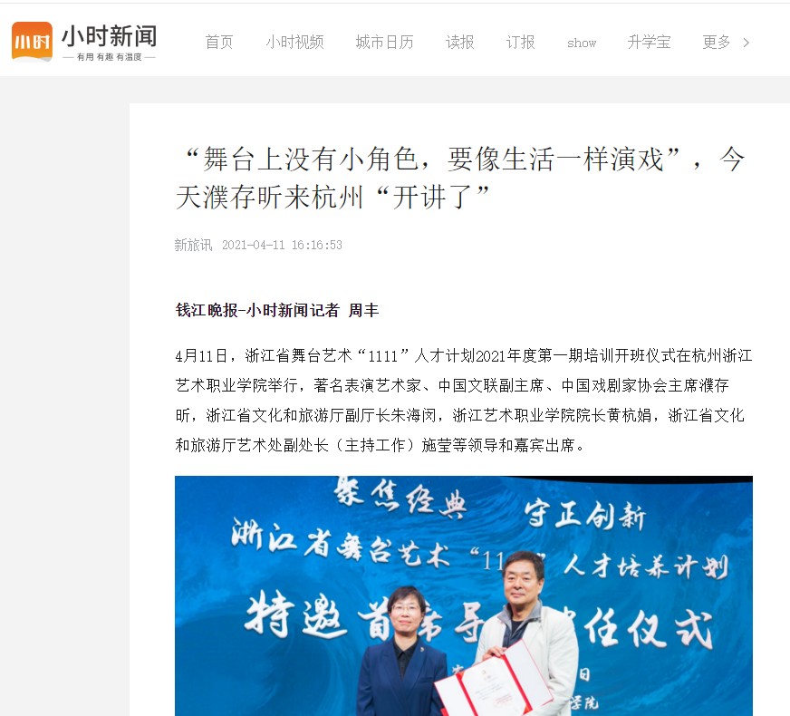 4月11日,浙江省舞台艺术“1111”人才计划2021年度第一期培训开班仪式在杭州浙江艺术职业学院举行,著名表演艺术家、中国文联副主席、中国戏剧家协会主席濮存昕,浙江省文化和旅游厅副厅长朱海闵,浙江艺术职业学院院长黄杭娟,浙江省文化和旅游厅艺术处副处长(主持工作)施莹等领导和嘉宾出席。