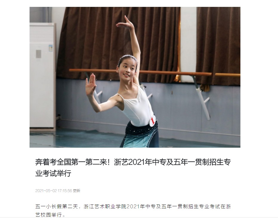 今年浙艺中专2021届学生艺考成绩亮眼,舞蹈表演班23名同学分别通过北京舞蹈学院、中央戏剧学院、上海戏剧学院、中央民族大学、浙江音乐学院等知名艺术院校的本科入学专业考试,有的同学专业考成绩名列全国第一第二,有的同学同时收获多个院校的专业考试上线通知。