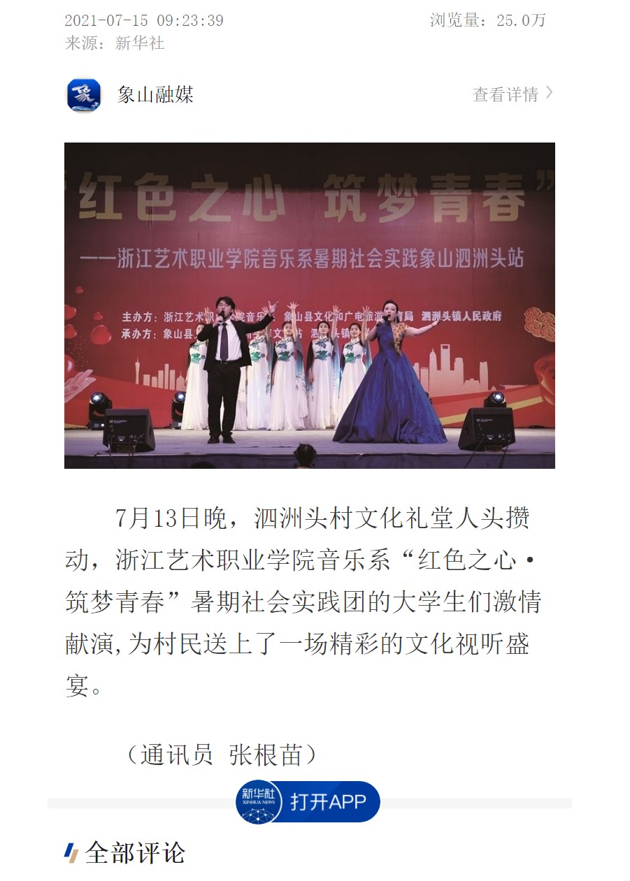 7月13日晚,泗洲头村文化礼堂人头攒动,浙江艺术职业学院音乐系“红色之心·筑梦青春”暑期社会实践团的大学生们激情献演,为村民送上了一场精彩的文化视听盛宴。