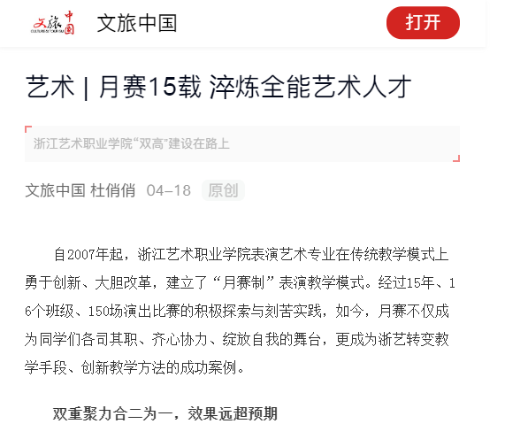 自2007年起,浙江艺术职业学院表演艺术专业在传统教学模式上勇于创新、大胆改革,建立了“月赛制”表演教学模式。经过15年、16个班级、150场演出比赛的积极探索与刻苦实践,如今,月赛不仅成为同学们各司其职、齐心协力、绽放自我的舞台,更成为浙艺转变教学手段、创新教学方法的成功案例。