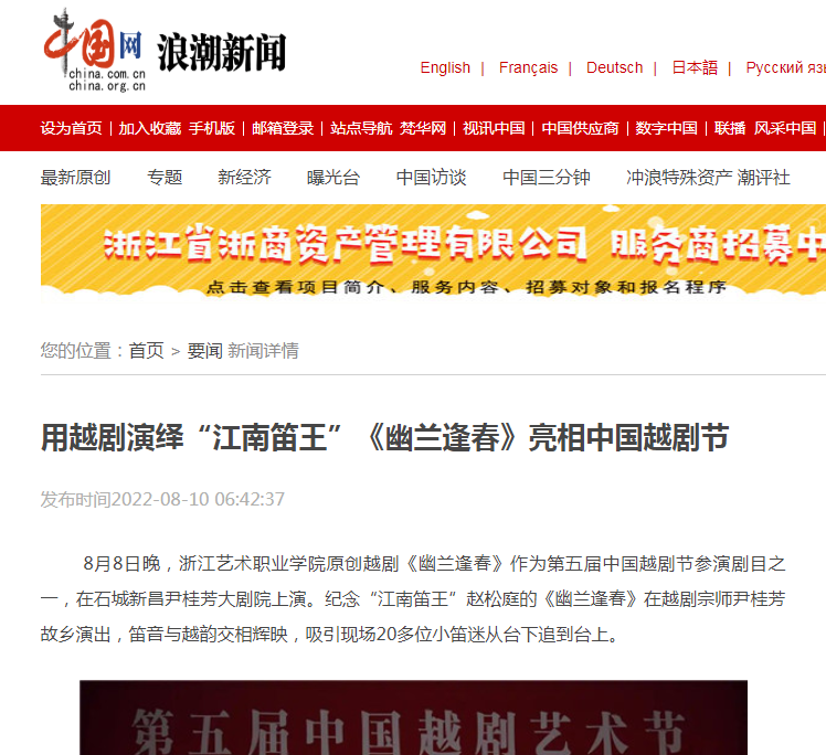 8月8日晚,浙江艺术职业学院原创越剧《幽兰逢春》作为第五届中国越剧节参演剧目之一,在石城新昌尹桂芳大剧院上演。纪念“江南笛王”赵松庭的《幽兰逢春》在越剧宗师尹桂芳故乡演出,笛音与越韵交相辉映,吸引现场20多位小笛迷从台下追到台上。