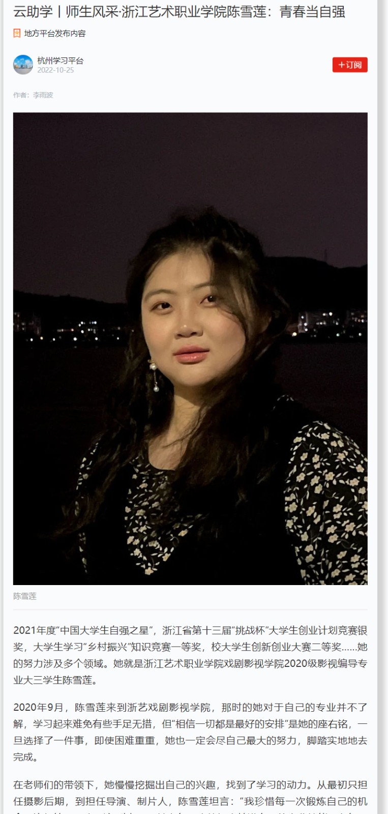 2021年度“中国大学生自强之星”,浙江省第十三届“挑战杯”大学生创业计划竞赛银奖,大学生学习“乡村振兴”知识竞赛一等奖,校大学生创新创业大赛二等奖……她的努力涉及多个领域。她就是浙江艺术职业学院戏剧影视学院2020级影视编导专业大三学生陈雪莲。
