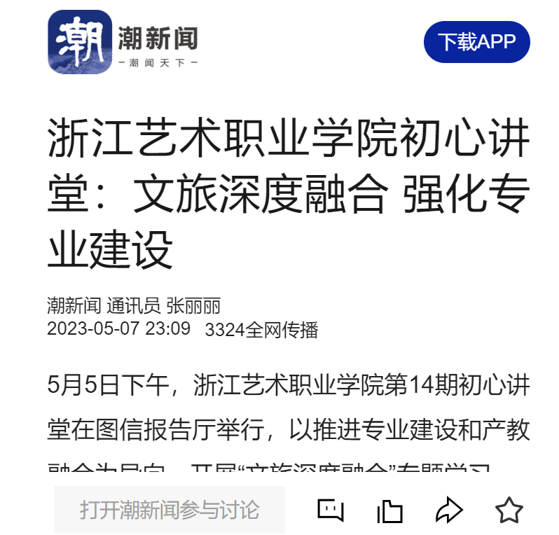 潮新闻:浙江艺术职业学院初心讲堂:文旅深度融合 强化专业建设