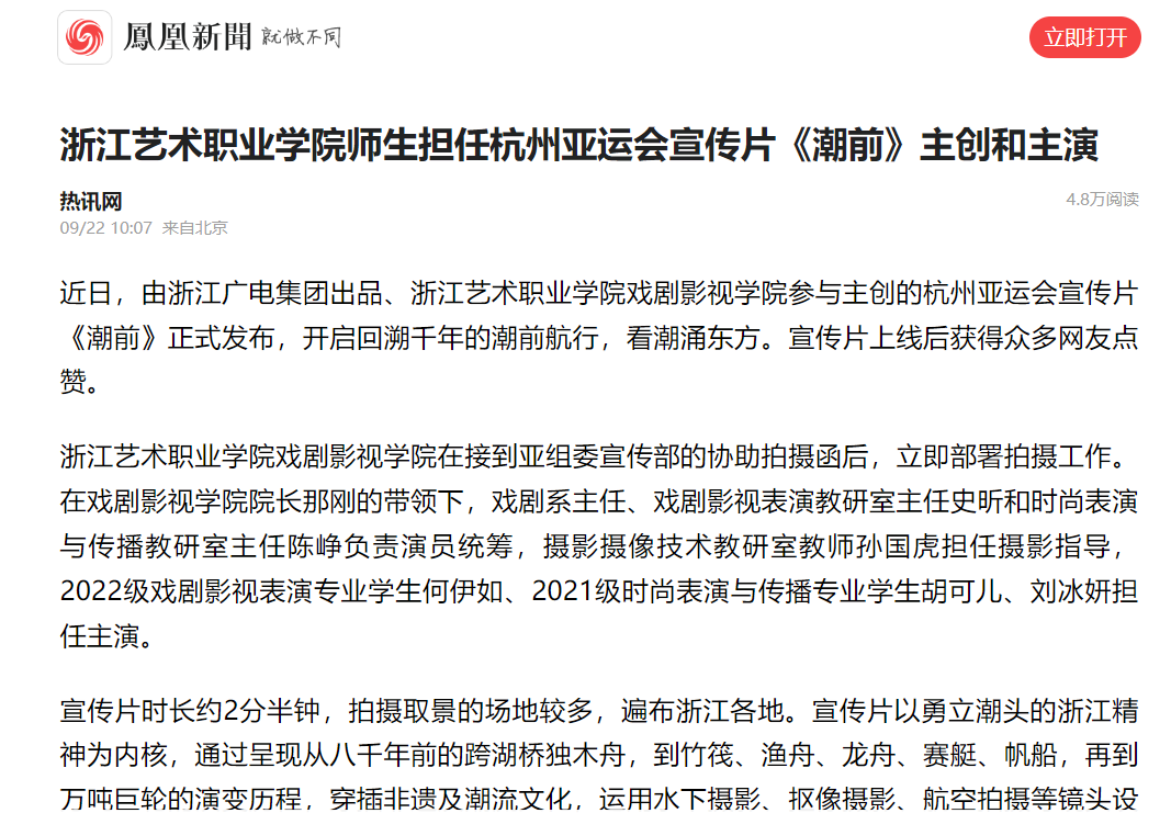 近日,由浙江广电集团出品、浙江艺术职业学院戏剧影视学院参与主创的杭州亚运会宣传片《潮前》正式发布,开启回溯千年的潮前航行,看潮涌东方。宣传片上线后获得众多网友点赞。