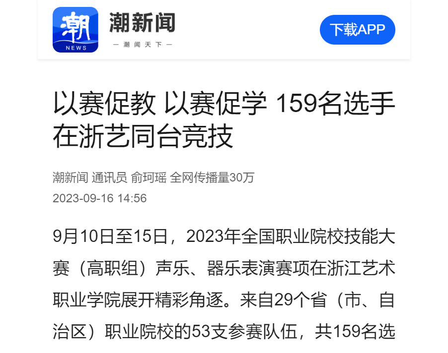 9月10日至15日,2023年全国职业院校技能大赛(高职组)声乐、器乐表演赛项在浙江艺术职业学院展开精彩角逐。来自29个省(市、自治区)职业院校的53支参赛队伍,共159名选手在浙艺同台竞技,展示青春风采。