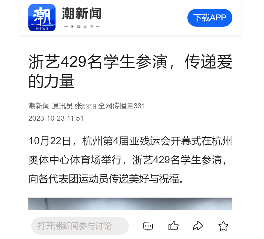 10月22日,杭州第4届亚残运会开幕式在杭州奥体中心体育场举行,浙艺429名学生参演,向各代表团运动员传递美好与祝福。