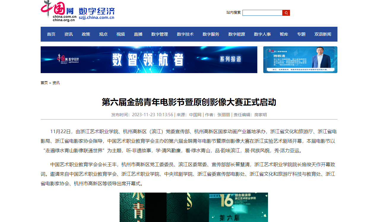 11月22日,由浙江艺术职业学院、杭州高新区(滨江)党委宣传部、杭州高新区国家动画产业基地承办,浙江省文化和旅游厅、浙江省电影局、浙江省电影家协会指导,中国艺术职业教育学会主办的第六届金鹄青年电影节暨原创影像大赛在浙江实验艺术剧场开幕,本届电影节以“走遍绿水青山影像联通世界”为主题,听·非遗故事,学·清风勤廉,看·绿水青山,品·韵味滨江,展·民族风貌,秀·活力亚运。