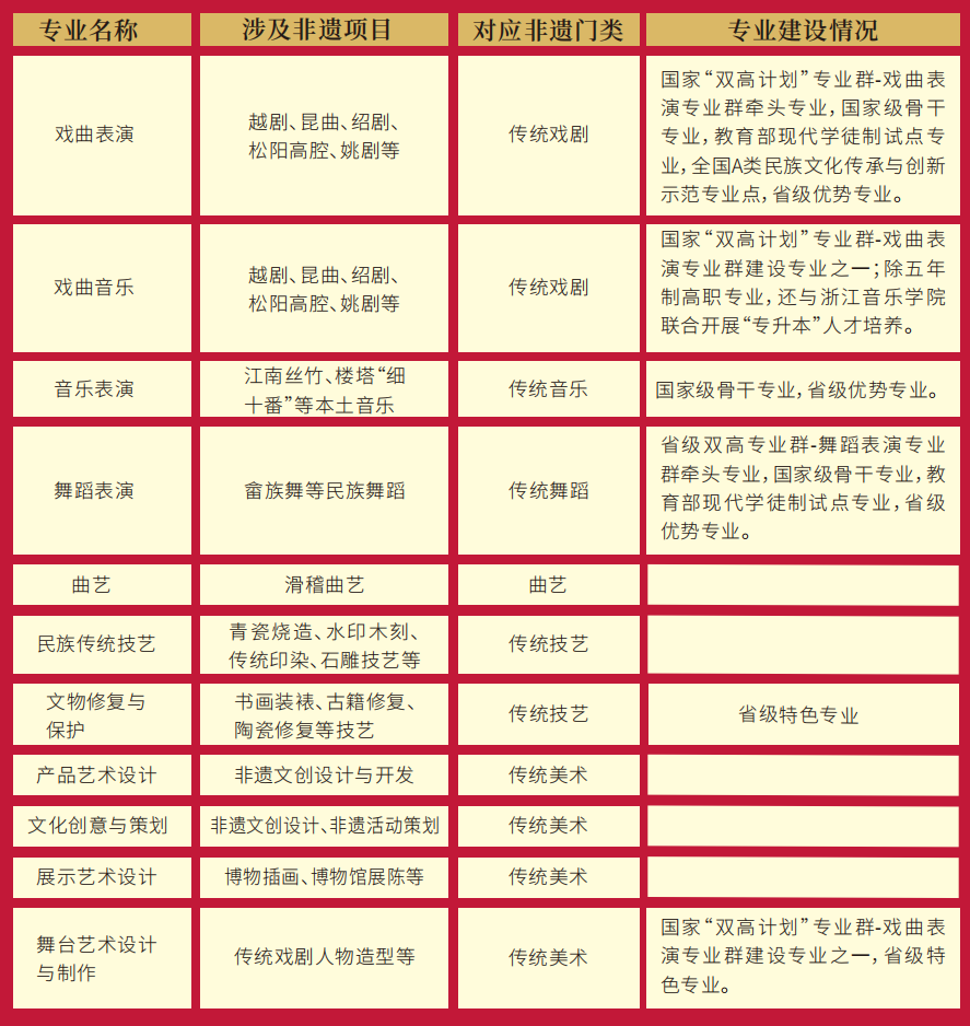 除此之外,浙江艺术职业学院还是“浙江省非物质文化遗产研究基地”和“浙江省非物质文化遗产传承基地”。近年来更是围绕国家和省级“双高计划”建设,重点打造地方戏曲剧种传承保护服务平台、艺术科技协同创新平台、剧(节)目创作平台、文化艺术与艺术职业教育研究平台,建设了7个非遗相关研究机构。