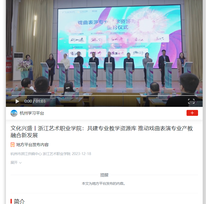 学习强国杭州平台:文化兴盛丨浙江艺术职业学院:共建专业教学资源库 推动戏曲表演专业产教融合新发展