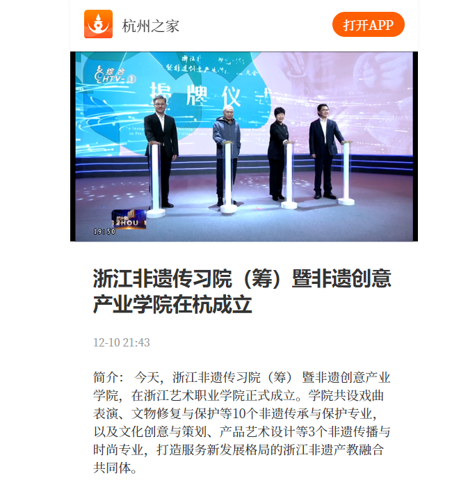 杭州电视台:浙江非遗传习院(筹)暨非遗创意产业学院在杭成立