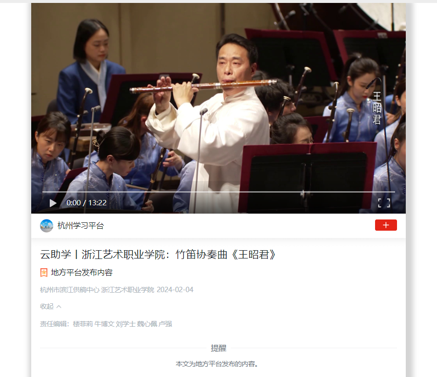 学习强国杭州平台:云助学丨浙江艺术职业学院:竹笛协奏曲《王昭君》