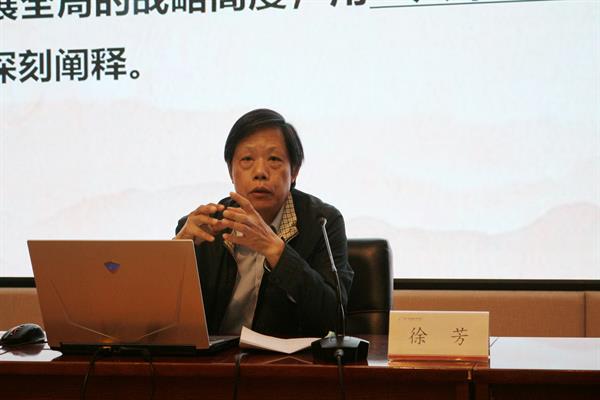 徐芳以《“大党独有难题”的时代答案》为题,结合主题教育相关要求,就大党独有难题的历史经验和时代内涵、提出大党独有难题的时代原因、破解大党独有难题的时代答案等三个方面与现场教师进行分享交流。