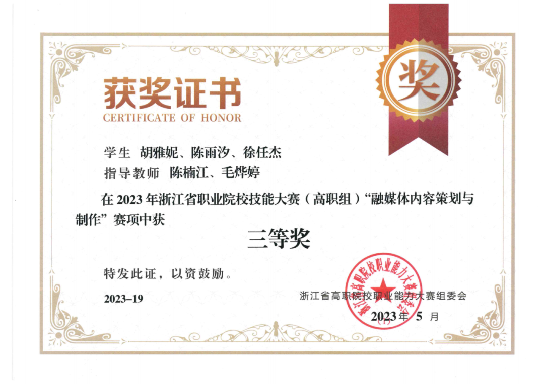2023年浙江省高职院校技能大赛暨全国职业院校技能大赛选拔赛“融媒体内容策划与制作”“短视频制作与运营”赛项于5月21日和5月27日陆续开赛,戏剧影视学院共斩获1个一等奖、2个三等奖。