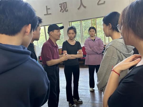 范益松带领学生们开展台词训练。他强调,台词是影响人物性格塑造的重要影响因素,每句台词都将影响到剧目带给观众的观感以及事件体现的明晰程度。他指出,同一句台词能够通过不同的角度、不同的腔调给同台表演的搭档传递不同的能量,让搭档在接受信息的同时能够及时做出相应的反馈,使演绎的事件更加具有戏剧性。现场,范益松还为参演浙艺第16届综合展演季开幕话剧《十二公民》的学生们予以指导,为大家讲解人物分析、人物塑造的技巧。他表示,要走进人物,体验人物真实内心情感,将“情”贯穿人物的表演中,将剧中的每个角色变得鲜活起来。