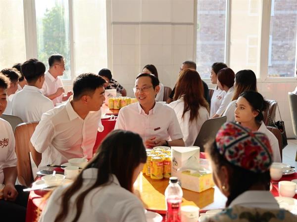 9月9日傍晚,新疆理工学院党委常委、副校长贺东辉,浙江艺术职业学院党委书记薛亮,校长施俊天,党委副书记夏开堂,副校长徐芳、刘秀峰,演教学院院长潘骅及班主任与27名新生们在食堂共进晚餐。