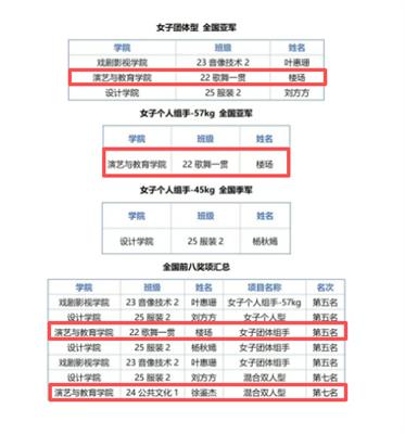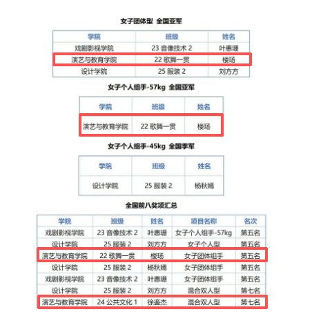 在基础教学部(公共体育部)副主任顾才铭、专任教师王子涵的带领下,演艺与教育学院22歌舞一贯楼玚荣获乙组女子团体型第二名、乙组个人组手-57kg第二名、乙组混合团体组手第五名的成绩;24公共1徐鉴杰获混合双人型第七名的成绩。