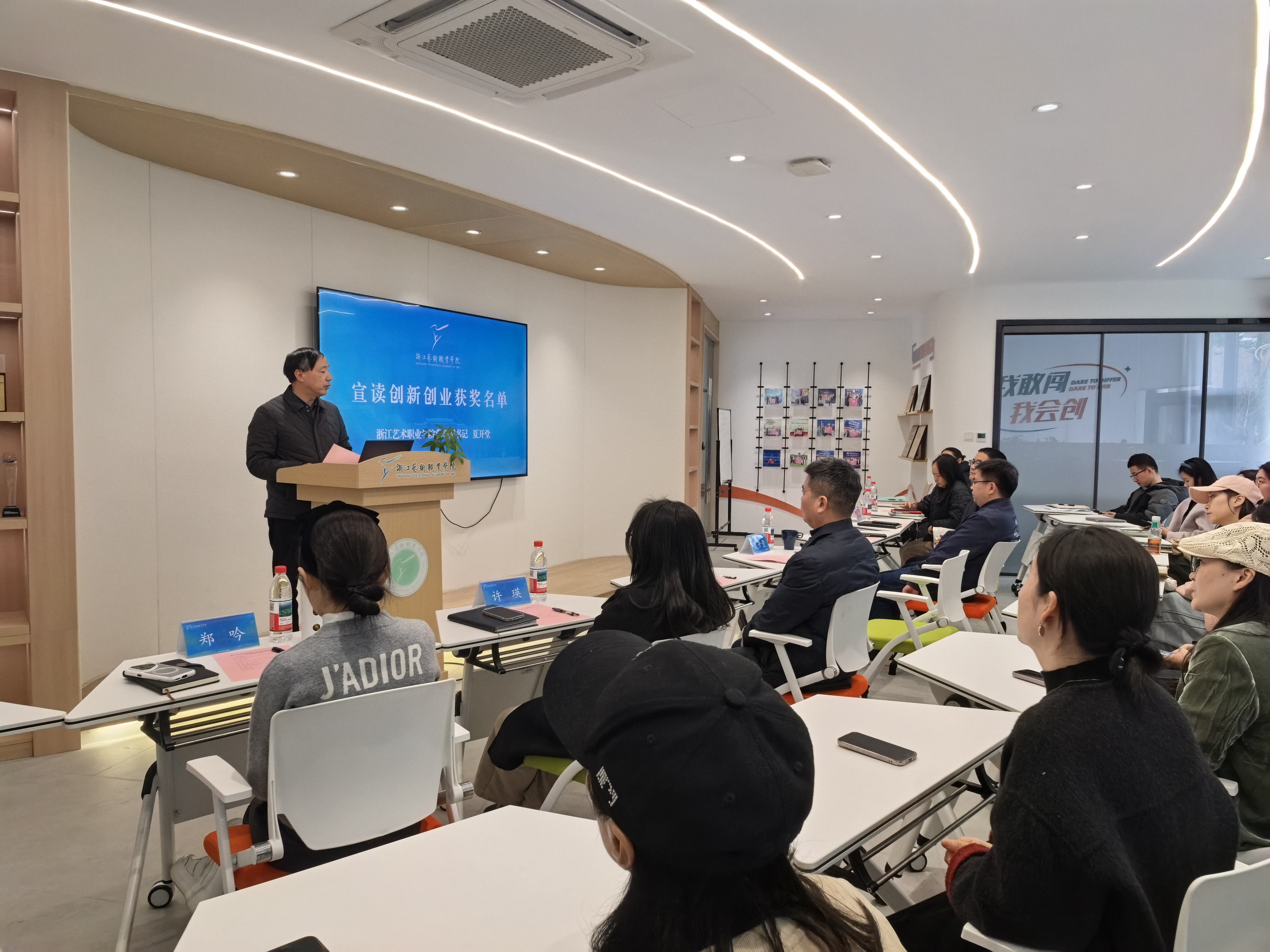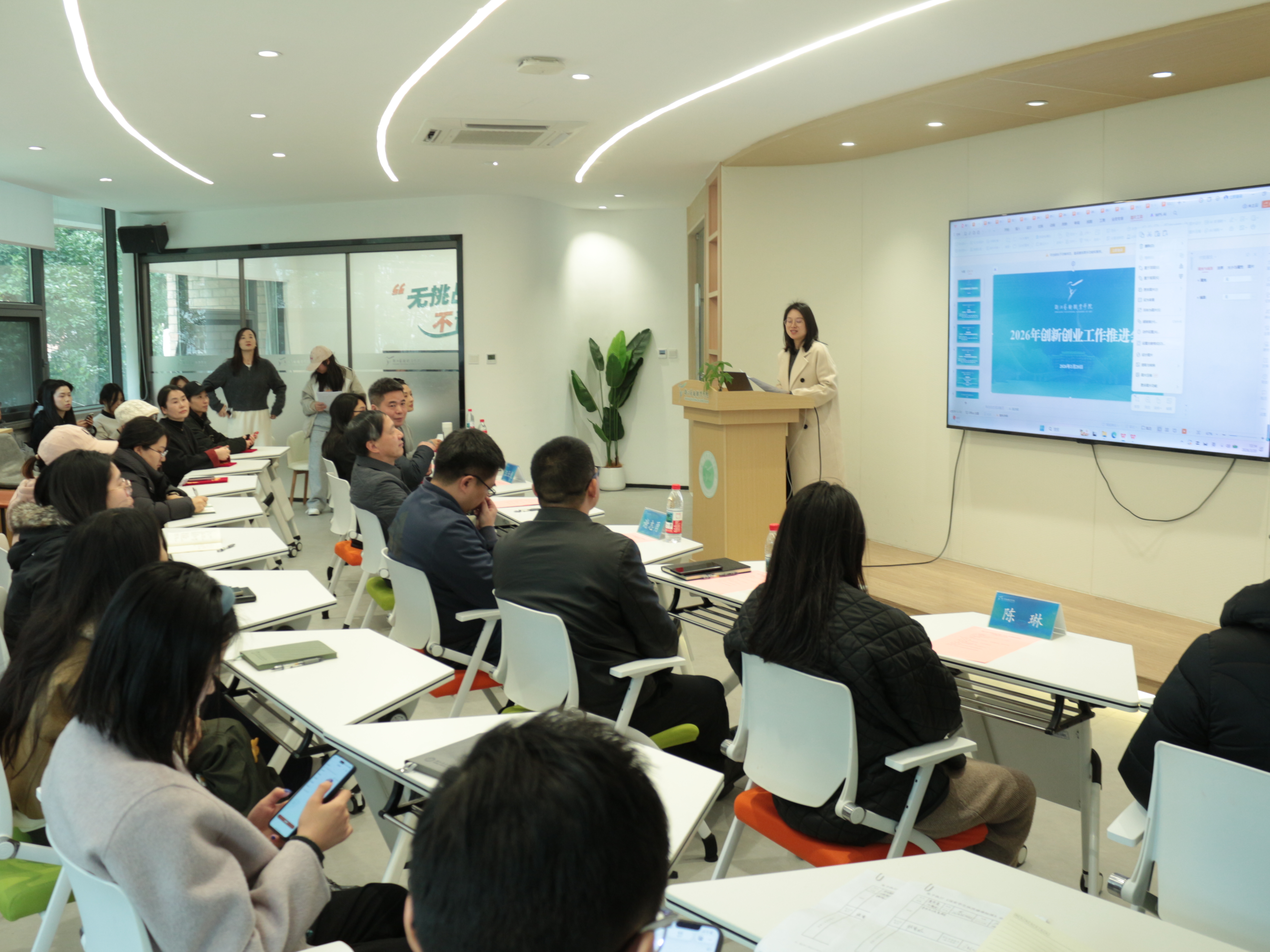 近日,浙江艺术职业学院2026年创新创业工作推进会在众创空间举行,学校党委副书记夏开堂,学工部以及各二级学院双创分管领导、辅导员、师生代表等参加会议。