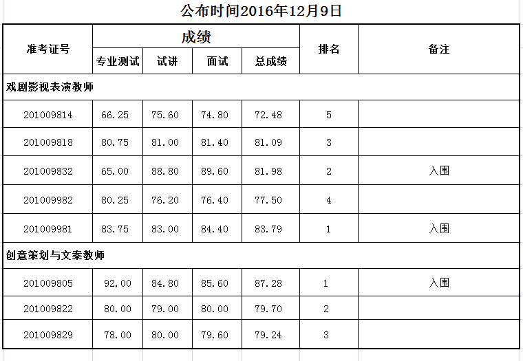 【招聘】浙江艺术职业学院2016年特殊专业技术岗位公开招聘考试结果