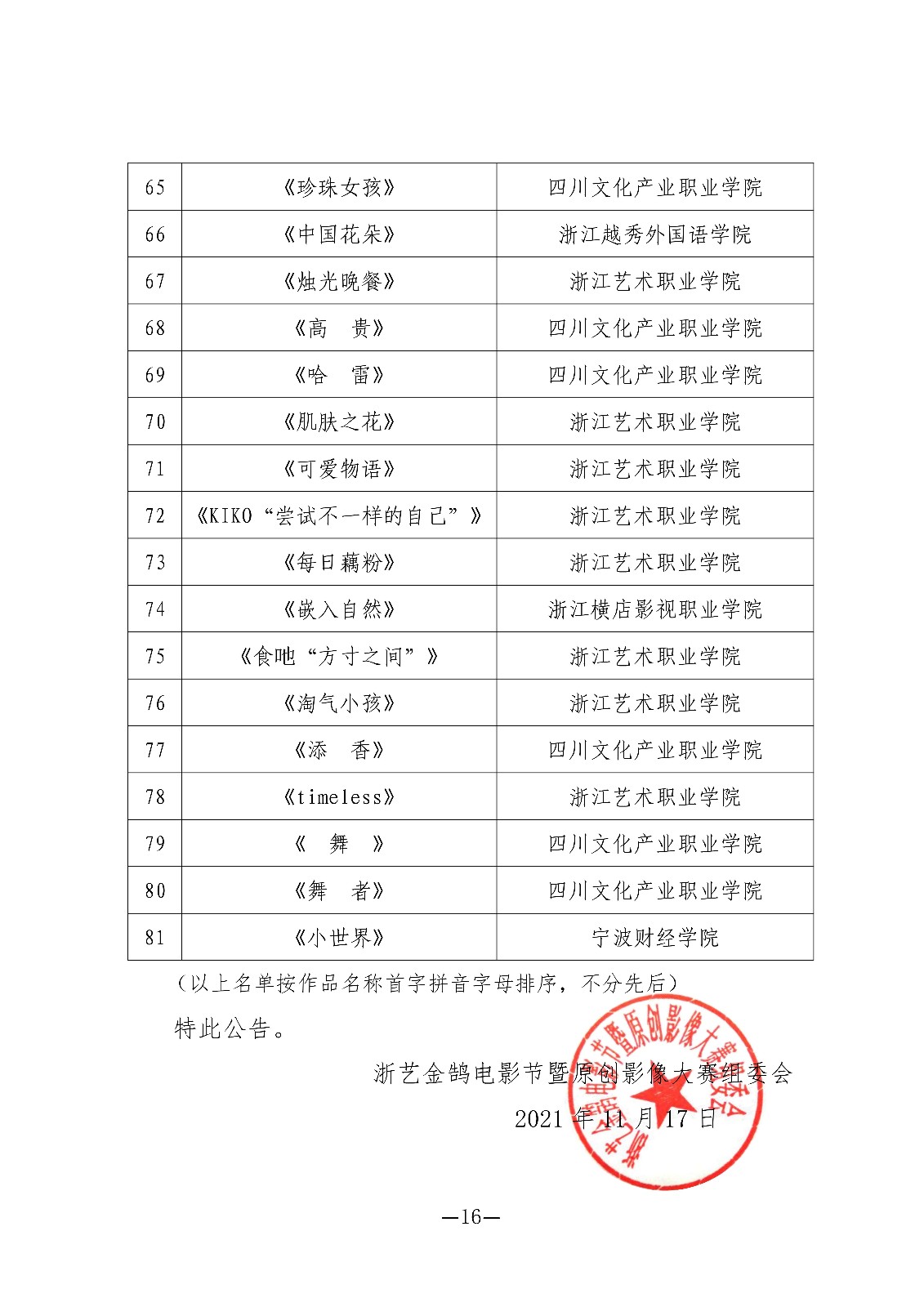 关于第四届浙艺金鹄电影节暨原创影像大赛入围名单的公告