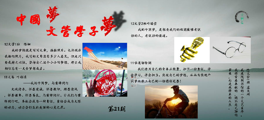 为深入学习贯彻党的十八大精神,引导全院广大学生为实现国家富强、民族复兴、人民幸福的伟大“中国梦”而勤奋学习、立志成才、积极进取,根据浙江艺术职业学院《关于深入开展“我的中国梦”主题教育活动的通知》精神,组织全院各教学单位开展“中国梦”主题教育宣传栏比赛。经过一个月的精心策划、制作,各教学系部策划制作出各具特色的“中国梦”主题宣传栏,有的反映各系教学风采和学风精神,有的反映师生对于“中国梦”的向往,有的对“中国梦”进行溯源,等等,参评作品有着较高的质量,令人耳目一新。