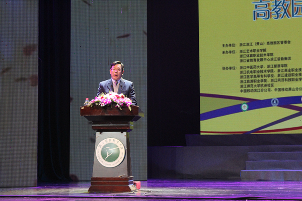 随后,滨江高教园区管委会办公室主任朱鸿飞致辞。他表示,文化节为高教园区师生提供了展现自身才华和青春活力的舞台,为园区内各学校间相互交流、学习提供了机会,展示出了各院校校园文化建设的丰硕成果,对总结园区文化艺术教育工作的成功经验、提升园区高校素质教育水平具有极大的推动作用。