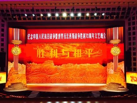 9月3日晚,纪念中国人民抗日战争暨世界反法西斯战争胜利70周年文艺晚会《胜利与和平》在北京人民大会堂隆重举行。整场晚会以抗战重要历史节点和典型事件场景为主线,选取抗战经典歌曲,把气势磅礴的大合唱作为主要表现形式,融合交响化和民族化的音乐、舞蹈、戏剧、情境表演、诗朗诵、多媒体等艺术手段,主题鲜明,主线突出,大气磅礴,催人奋进,唱响了中国人民抗击侵略的英雄凯歌,抒写了中华民族共御外侮的壮丽史诗,突出表现了中国共产党在抗战中的中流砥柱作用,反映了中国作为东方主战场为世界反法西斯战争胜利作出的不可磨灭的贡献。
