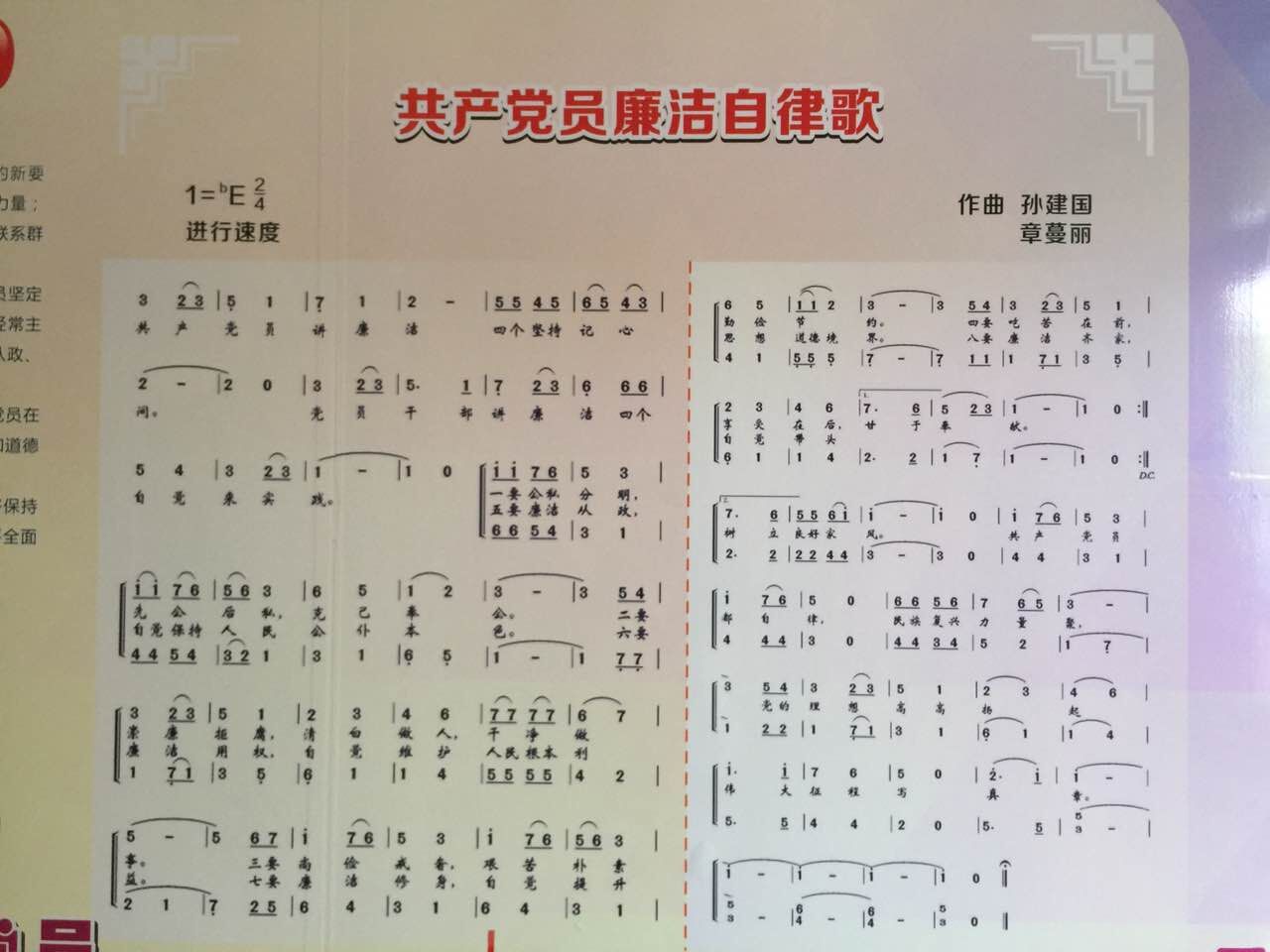 去年底,受省直机关工委委托,章蔓丽承担了为《共产党员廉洁自律歌》物色曲作者并共同谱曲的任务,孙建国欣然应约创作。两位作者在不到一周的时间里完成谱曲任务。经省直机关工委领导和音乐方面专家对所有约稿作品进行遴选评定,最终,由孙建国、章蔓丽作曲的《共产党员廉洁自律歌》被录用,将配合“两学一做”专题教育活动在省直机关党员领导干部中传唱。