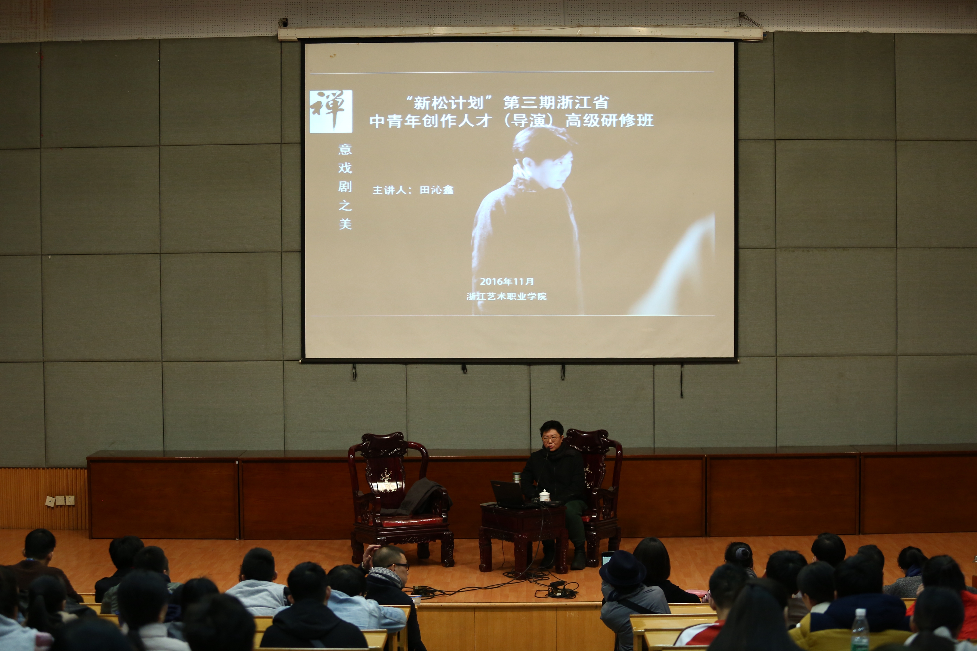 11月9日,“新松计划”第三期全省中青年创作人才(导演)高级研修班在浙江艺术职业学院开班。本期培训班师资团队名家荟萃,主教是浙江艺术职业学院特聘教授、一级导演杨小青,授课老师特邀中国国家话剧院一级导演、北京大学影视戏剧研究中心副主任、上海戏剧学院教授田沁鑫,上海戏曲艺术中心艺委会主任、一级编剧李莉,中央戏剧学院原副院长、博导罗锦鳞与戏文系主任、教授彭涛,上海戏剧学院教授、导演田蔓莎,著名舞美专家刘科栋、周正平、蓝玲,以及著名编剧、策划人史航、著名舞蹈编导李世博等。省文化厅副厅长刁玉泉、浙江艺术职业学院党委书记朱海闵,教师代表杨小青、田沁鑫,省文化厅艺术处处长薛亮,以及负责此次高研班的浙艺戏剧系主任支涛等教师、高研班全体学员参加开班仪式。院长黄杭娟主持。