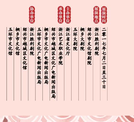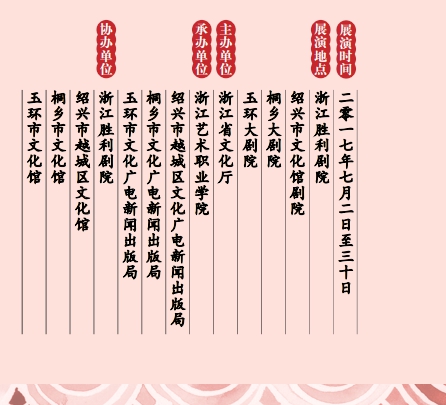 为展示近年来在省委、省政府扶持下我省民营文艺表演团体发展壮大成果,2017年浙江省民营文艺表演团体(以下简称民营剧团)展演活动将于7月2日在浙江胜利剧院开幕。演出由浙江省文化厅主办,浙江艺术职业学院、绍兴市越城区文化广电新闻出版局、桐乡市文化广电新闻出版局、玉环县文化广电新闻出版局承办。