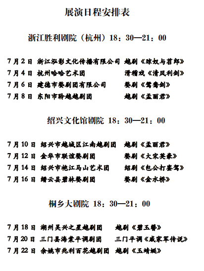 展演开幕式上,浙江泓影文化传播有限公司将演出越剧《琼奴与苕郎》。整个7月,全省民营剧团展演将在杭州、绍兴、桐乡、玉环上演15台大戏,包括越剧《孟丽君》、滑稽戏《清风利剑》、婺剧《鸳鸯剑》、绍剧《包公打銮驾》、三门平调《戚家军传说》、乱弹《生死牌》、瓯剧《武松》等。
