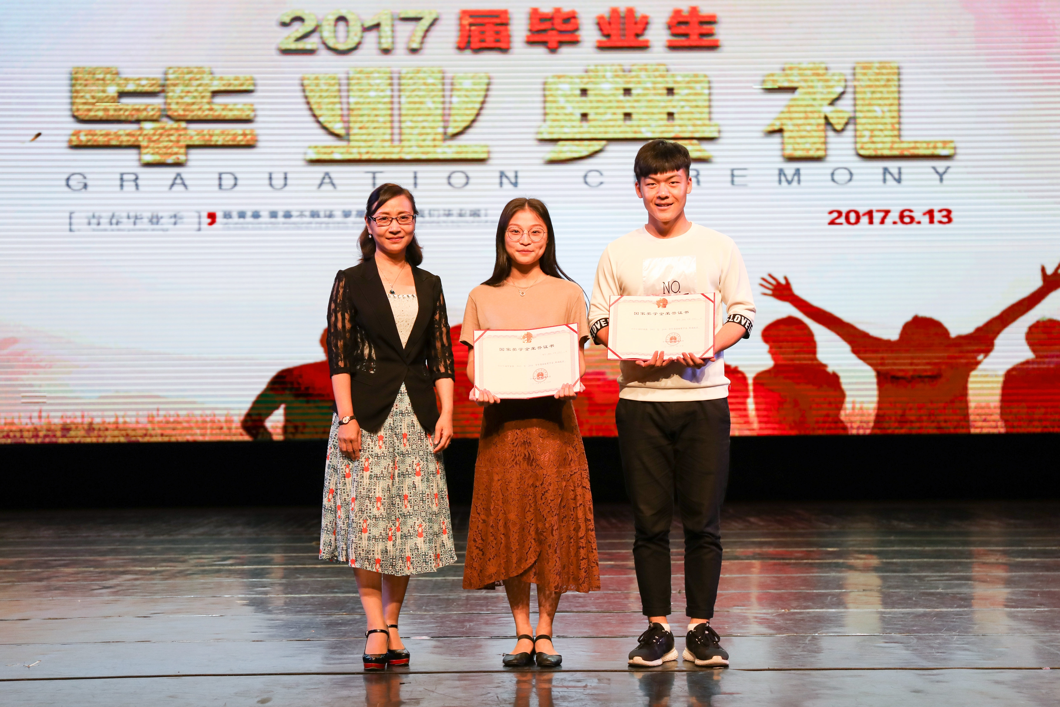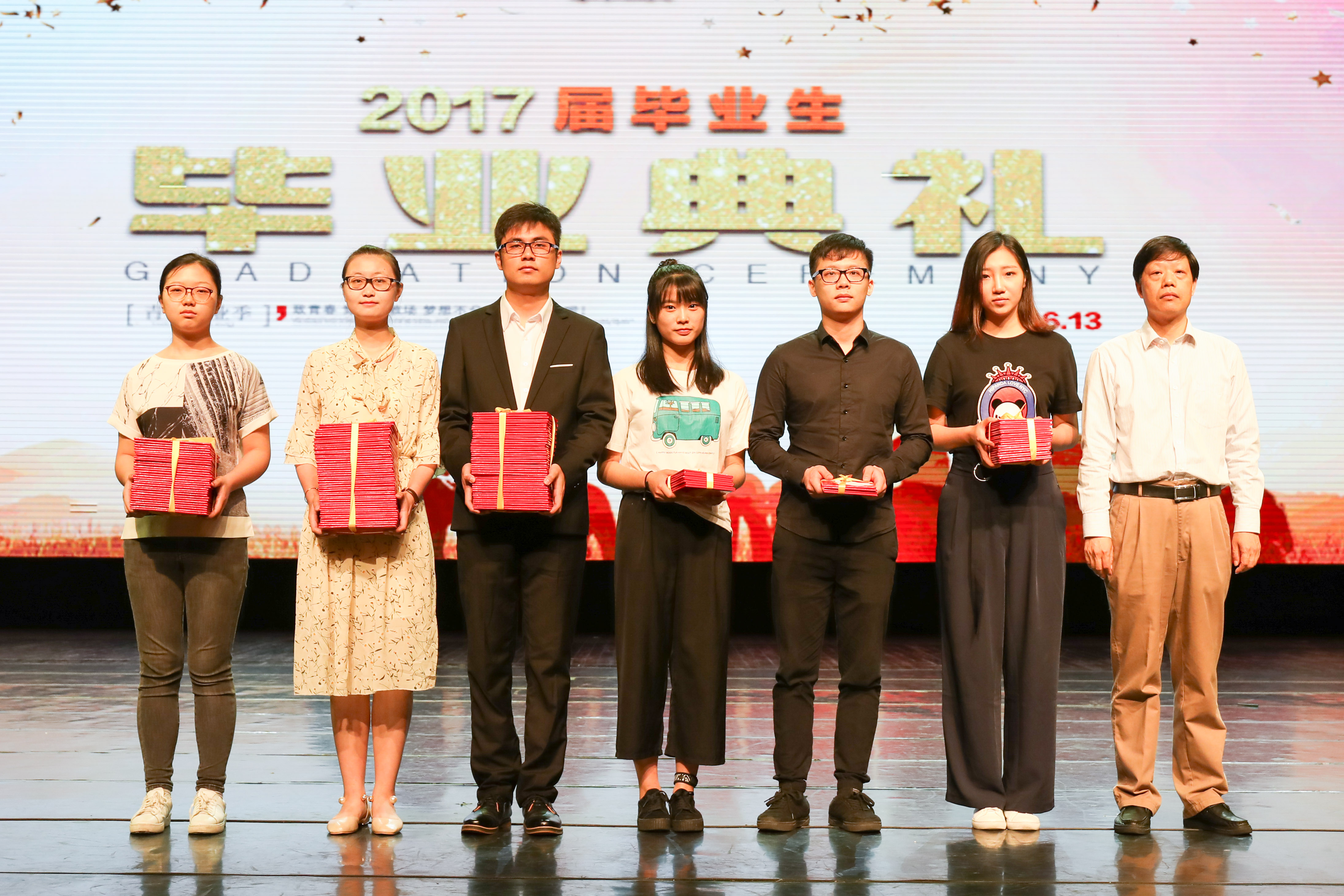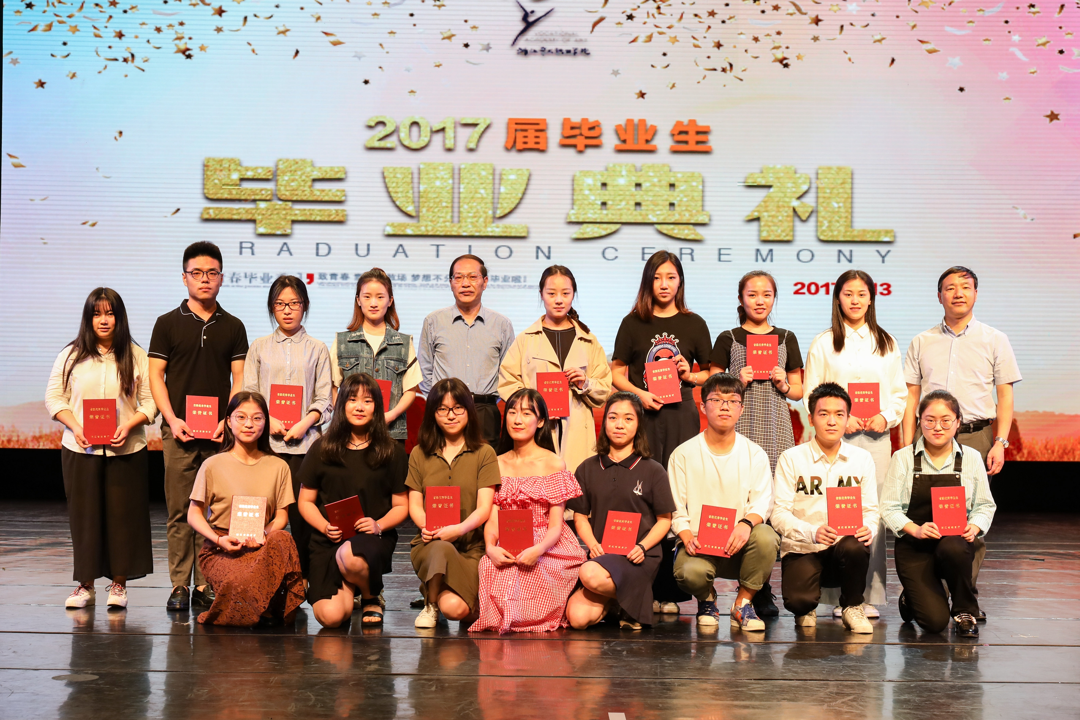 毕业典礼上,公布了与毕业生有关的一系列荣誉并颁发证书,包括了综合展演季优秀学生、2017届优秀毕业论文、2017届院级优秀毕业生、2017届省级优秀毕业生、国家奖学金获得者等,院领导分别为毕业生颁奖。