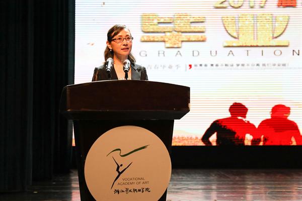院长黄杭娟为毕业生致辞。她说,我们在这里共同见证1100多位毕业生完成学业踏上新的征程。募然回首,你们的那么多细节、那么多片断、那么多场景如此清晰。在这里你们经历了学校的六十华诞,见证了学校的发展,参加了学校服务社会的各项活动,在省级、国家级各类大赛中摘金夺银、勇攀高峰。在举世瞩目的G20《最忆是杭州》大型文艺晚会上为世界观众留下了精彩和美丽。在这里的每一处,你们都在书写着美丽的诗篇,描绘着青春的画面,为学校续写着辉煌与灿烂。一代又一代浙艺人共同诠释着学校“求真 尚美 精艺 修为”校训,留下的汗水已经铭刻在它的每一寸地方永远不会消失。你们身上也深深地烙下了浙艺的印记。感谢你们这几年给浙艺以清新,给浙艺以热情,给浙艺以包容,给浙艺留下永远的记忆与回味。