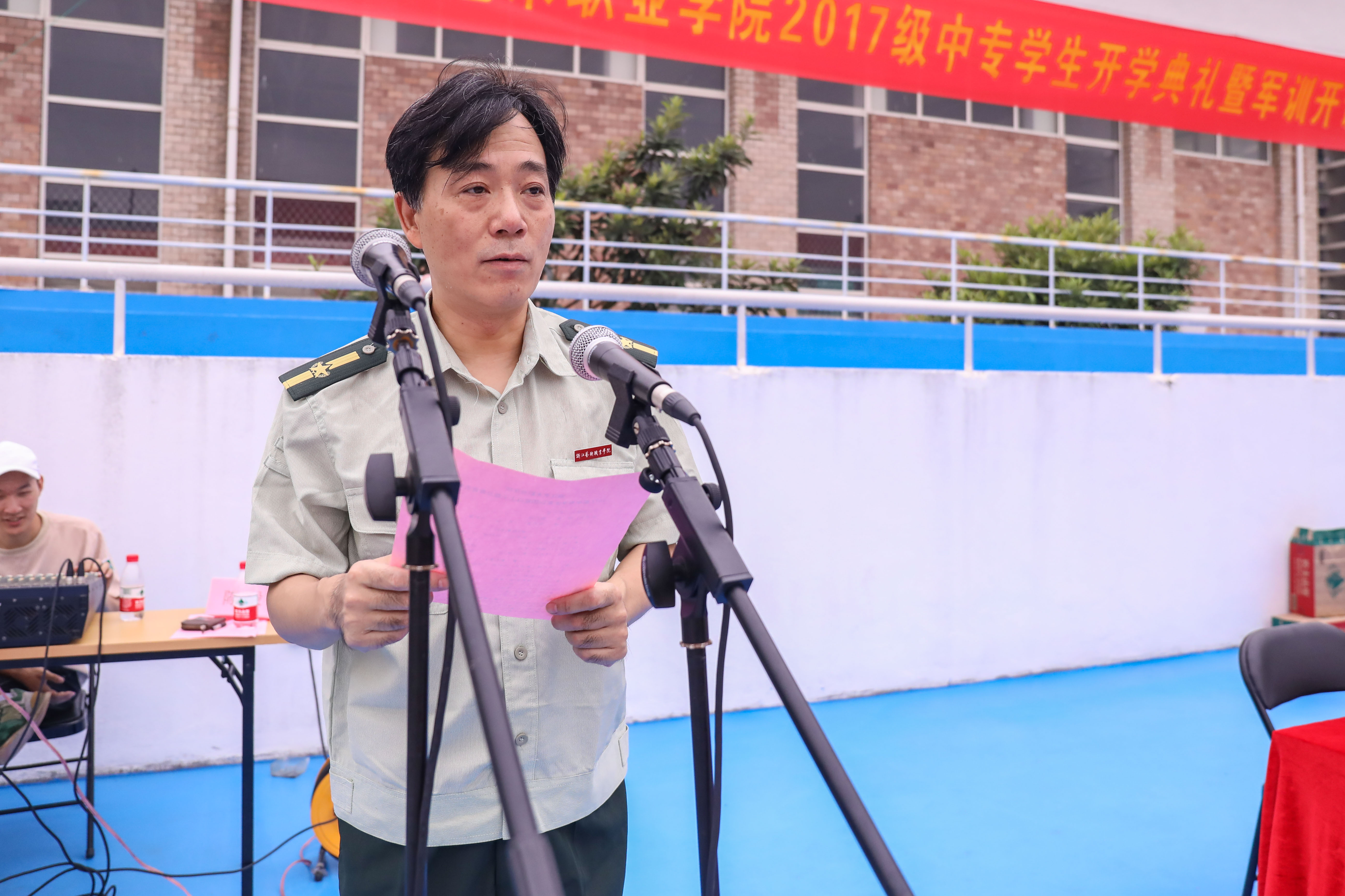 911日上午,浙江艺术职业学院2017级中专及五年一贯制新生开学典礼暨军训开训仪式在风雨操场举行。我院党委书记朱海闵、党委委员、副院长沈恒、夏开堂,浙江警察学院方杭富老师等出席,戏剧系、音乐系、舞蹈系党总支专职副书记及班主任、辅导员等老师和300多名新生参加。院学工部副部长(主持工作)陈毅主持典礼。
