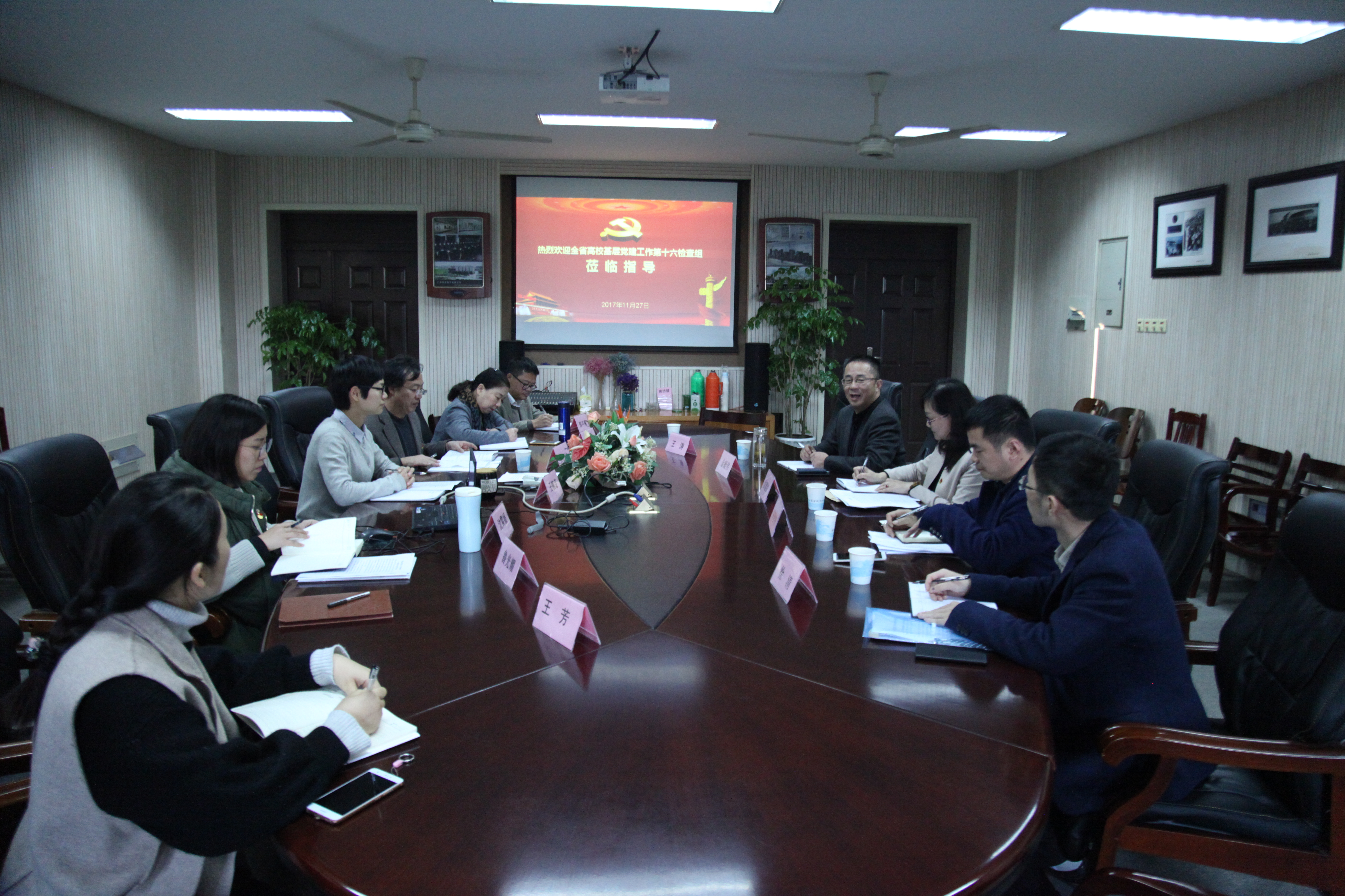 11月27日,省委教育工委高校基层党建工作第十六检查组一行在湖州职业技术学院党委副书记金毅伟的带领下,对我校基层党建工作进行了专项调研检查。学校举行了党建工作汇报会。校党委书记朱海闵,党委副书记、院长黄杭娟,党委委员、副院长夏开堂出席汇报会,党委职能部门负责人、各党总支负责人参加会议。