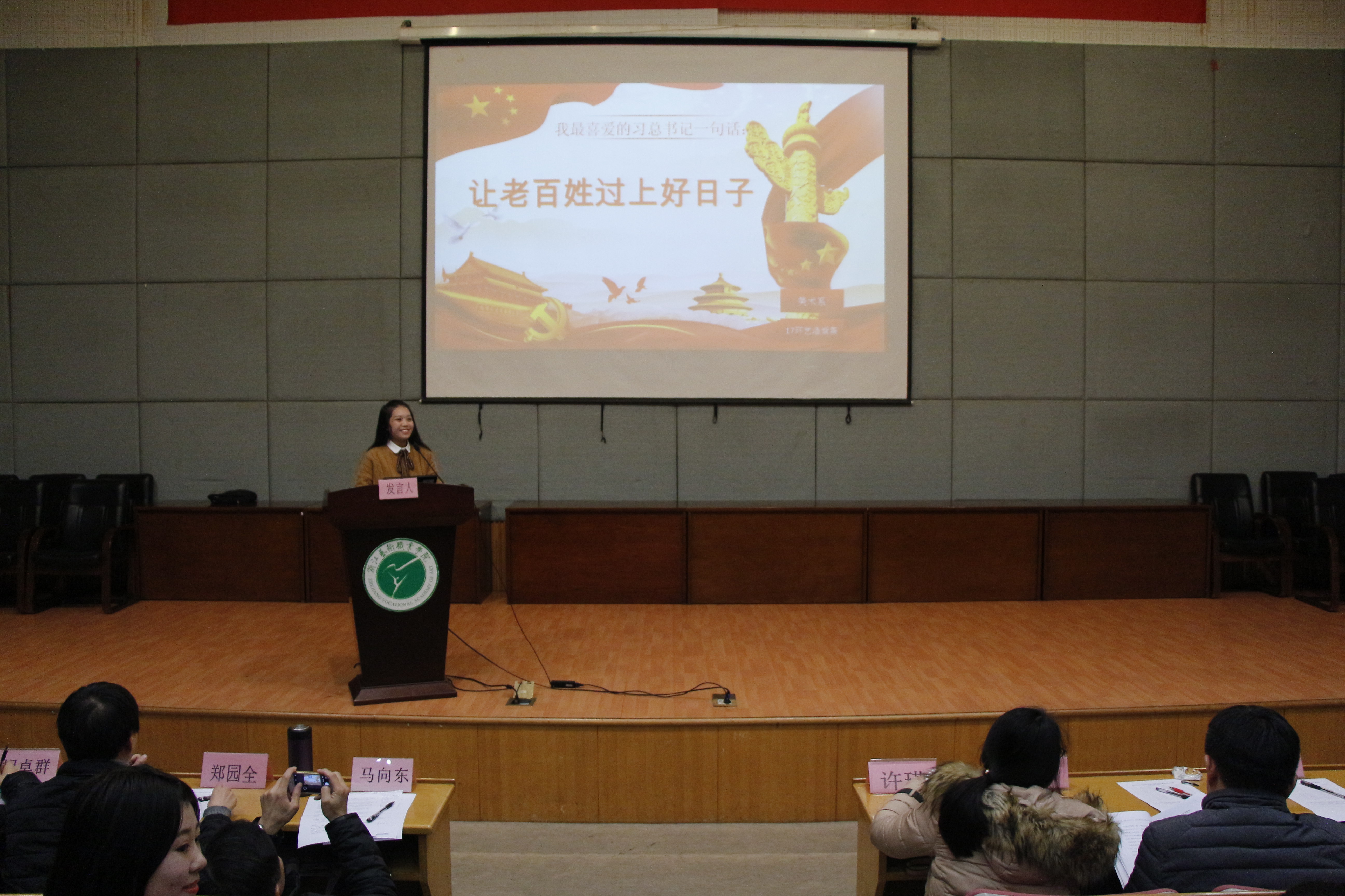 由各系推荐参赛的12名学生围绕“我最喜爱的习总书记一句话”主题,结合个人学习体会、专业特色和社会实践,作了精彩的微型党课展示,展现了党校学员对于十九大精神的学习体会、思想认识和理想抱负,展现浙艺学生的精神风貌。比赛有序进行,既是论坛,又是课堂。每位参赛学员选出一句自己最喜爱的习总书记的一句话为主题进行演讲,12名参赛者都有各自的思想闪光点,比赛中各显风采。“青春是用来奋斗的”、“让老百姓过上好日子”、“勇做时代弄潮儿”、民生是人民幸福之基、社会和谐之本”、“民生连着民心、民心凝聚民力,人民对美好生活的向往,就是我们的奋斗目标”、“青年兴则国家兴,青年强则国家强”、“有信念、有梦想、有奋斗的人生,才是有意义的人生”等习近平总书记说过的话,在同学们慷慨激昂的党课讲述中展现得形象生动、感人肺腑,感动着全场的每一位观众。