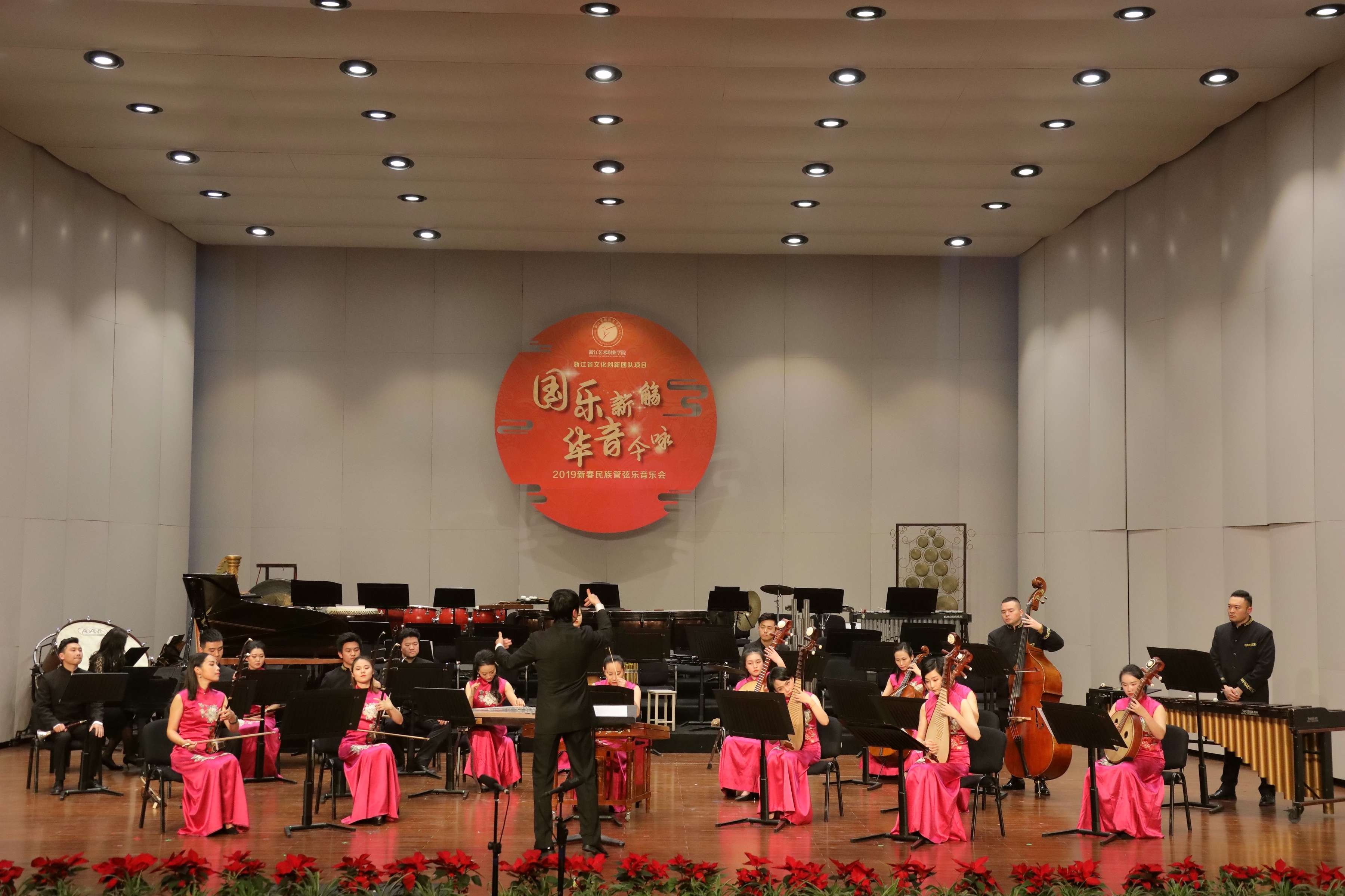 2019踏着欢歌声走来,由浙江省委宣传部、浙江省文化和旅游厅主办的2019浙江省属文艺院团新年演出季,1月8日晚在浙江音乐厅上演了2019新春民族管弦乐音乐会。音乐会由浙江艺术职业学院承办,国乐新觞,华音今咏,感染了现场观众。这是浙江艺术职业学院继10月张凌琵琶独奏音乐会、11月吴樟华竹笛独奏音乐会后,再一次在浙江音乐厅奏响国乐之音。