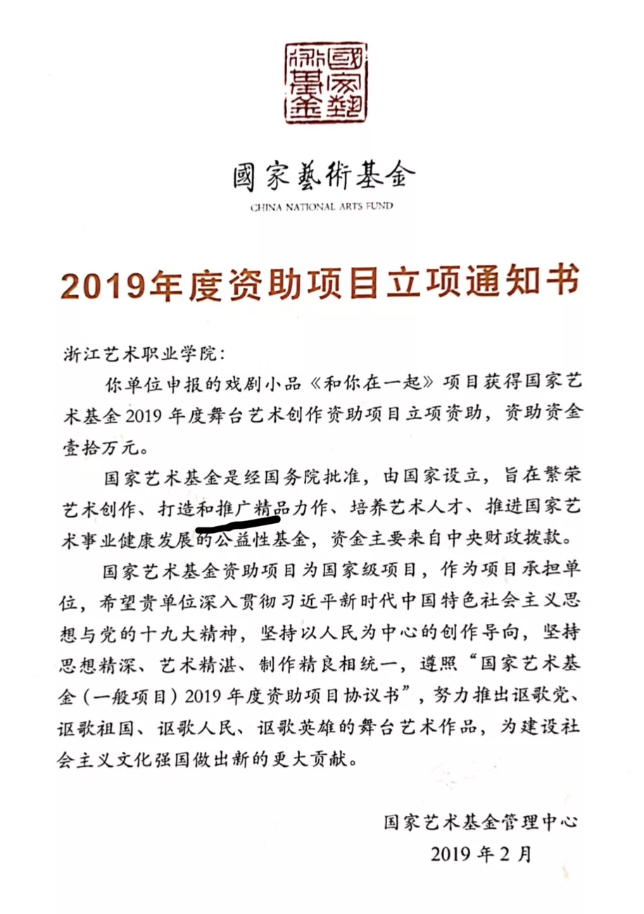《和你在一起》起初是戏剧影视表演专业的学生在原创小品学习阶段创作的一个作品,讲述了一位需要24小时照顾、患有阿尔兹海默症的母亲和她儿子、儿媳之间的感人故事。该作品在过去几年中也经过多次打磨,曾在浙江省大学生艺术节上获得金奖,随后作为浙江省唯一代表作品参加了2015年第四届全国大学生艺术节,获得艺术表演类一等奖。主创团队在学校的大力支持下,希望将这部富有温度和正能量的作品在更多的舞台上演出,传递世间亲情的美好。