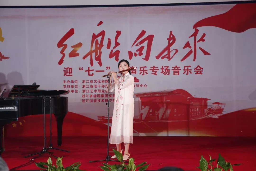小组唱《红船向未来》拉开了音乐会序幕,8位女党员婉转温柔的嗓音和着来自崇文实验学校的少先队员姜茗轲清澈澄净的童声演绎着革命精神的传承与希望,抒发坚韧不拔、不畏艰难、坚定信念、奔向未来的情怀。音乐会上,《唱支山歌给党听》《听妈妈讲过去的事情》《太湖美》《洪湖水浪打浪》《珊瑚颂》《绒花》《卜算子·咏梅》《沁园春·雪》《我爱你中国》等经典歌曲的深情演绎,引起了听众对党和祖国真挚感情的共鸣,对美丽浙江的热爱。浙江能源集团董事长童亚辉的独唱,潘欣欣、戴初韵的小提琴钢琴协奏曲,浙艺音乐系肖思宁的笙独奏、常轶伟的笛子独奏作为嘉宾助演同台演出。