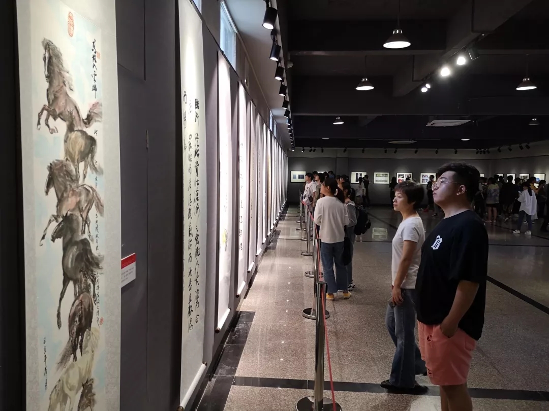 本次书画展由校党委宣传部、民间文艺研究中心、党委学工部、校工会主办,美术系、影视技术系、校书画协会等协办,自6月份征集启动以来,收到了退休老同志、校友、在校师生以及特邀书画名家的书画、摄影作品百余幅。所有作品还将在官微、校报等校园媒体展出,还将编印成册。这些作品的作者们,大到88岁老人,小到刚入小音乐班学习的十几岁孩子,他们用各自的方式表达了对祖国的热爱和对新时代的感怀。