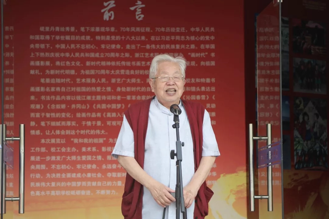 为庆祝中华人民共和国成立70周年,浙江艺术职业学院举办以“我和我的祖国”为主题的“画时代”书画摄影展,今天上午在美术系展厅举行开幕式。